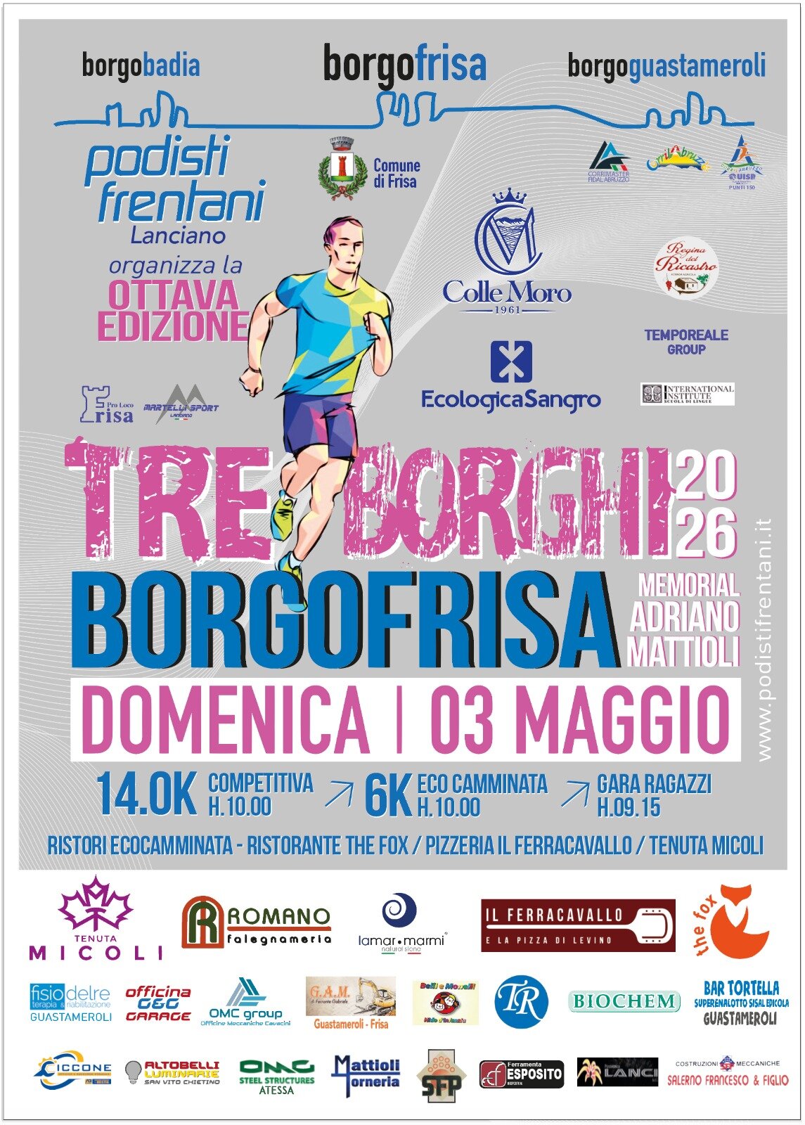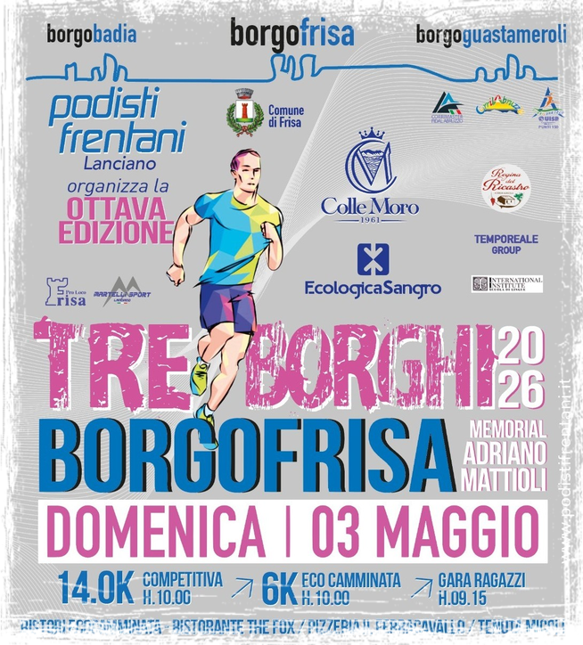 ASD Podisti Frentani è lieta di annunciare che la prossima emozionante gara podistica Tre Borghi è in arrivo! Siamo orgogliosi di essere gli organizzatori di questo evento eccezionale che attira atleti da tutta la regione. La nostra passione per la corsa e l'impegno nel promuovere uno stile di vita sano ci spingono a offrire un'esperienza indimenticabile a tutti i partecipanti. Ma non è solo la gara che rende speciale il nostro territorio. Le nostre colline pittoresche, i panorami mozzafiato e l'atmosfera accogliente fanno di questa zona un luogo ideale per gli amanti dello sport all'aria aperta. Unisciti a noi per vivere l'adrenalina della competizione, scoprire le bellezze del territorio e goderti una giornata indimenticabile con i Podisti Frentani!
